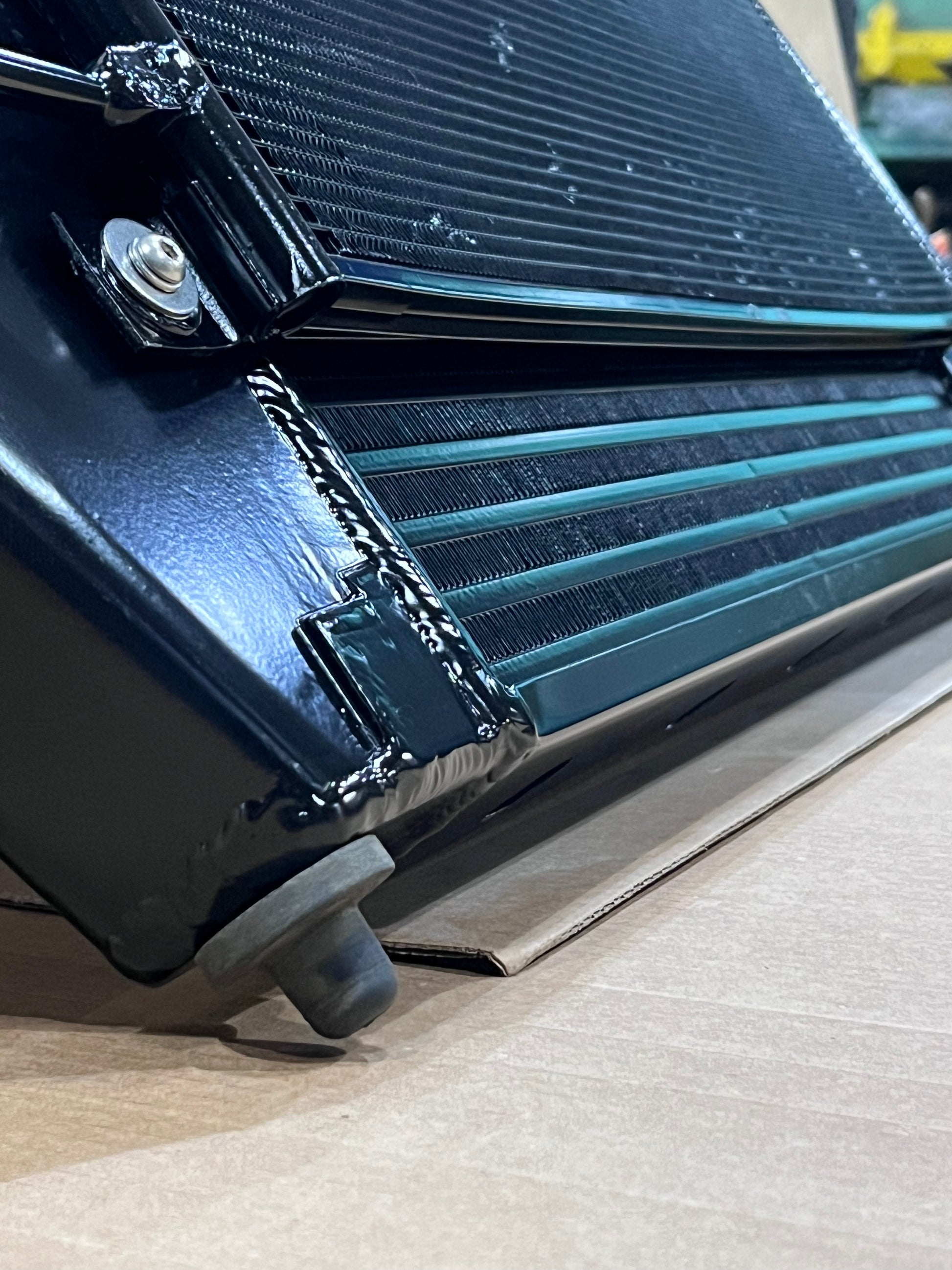 This is the first time an upgraded intercooler has been offered specifically for the 91.5-93 Dodge Ram Turbo Diesel since Gale Banks in the early 1990s. What you are looking at is all-new, off the shelf components we source and perform in-house modifications to make fit. We start with a 2003-2007 Ram intercooler and trim the overall height down to fit the 1st gen core support. Provisions are added for a new condenser and mounting tabs to complement factory radiator support mounting provisions. The condenser is fit with hand bent aluminum plumbing which routes though the existing radiator support plumbing location.